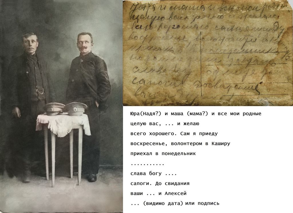 | Изображение | Формат: image/jpeg Размеры картинки: 1 024 × 745 пикселей Размер файла: 120 Кбайт Примечание: Подпись с обратной стороны: Юра(Надя?) и маша(мама?) и все мои родные целую вас, ... и желаю всего хорошего. Сам я приеду воскресенье, волонтером в Каширу приехал в понедельник ................... слава богу ...... сапоги. До свиданья ваши ... и Алексей ... (видимо дата) или подпись |
