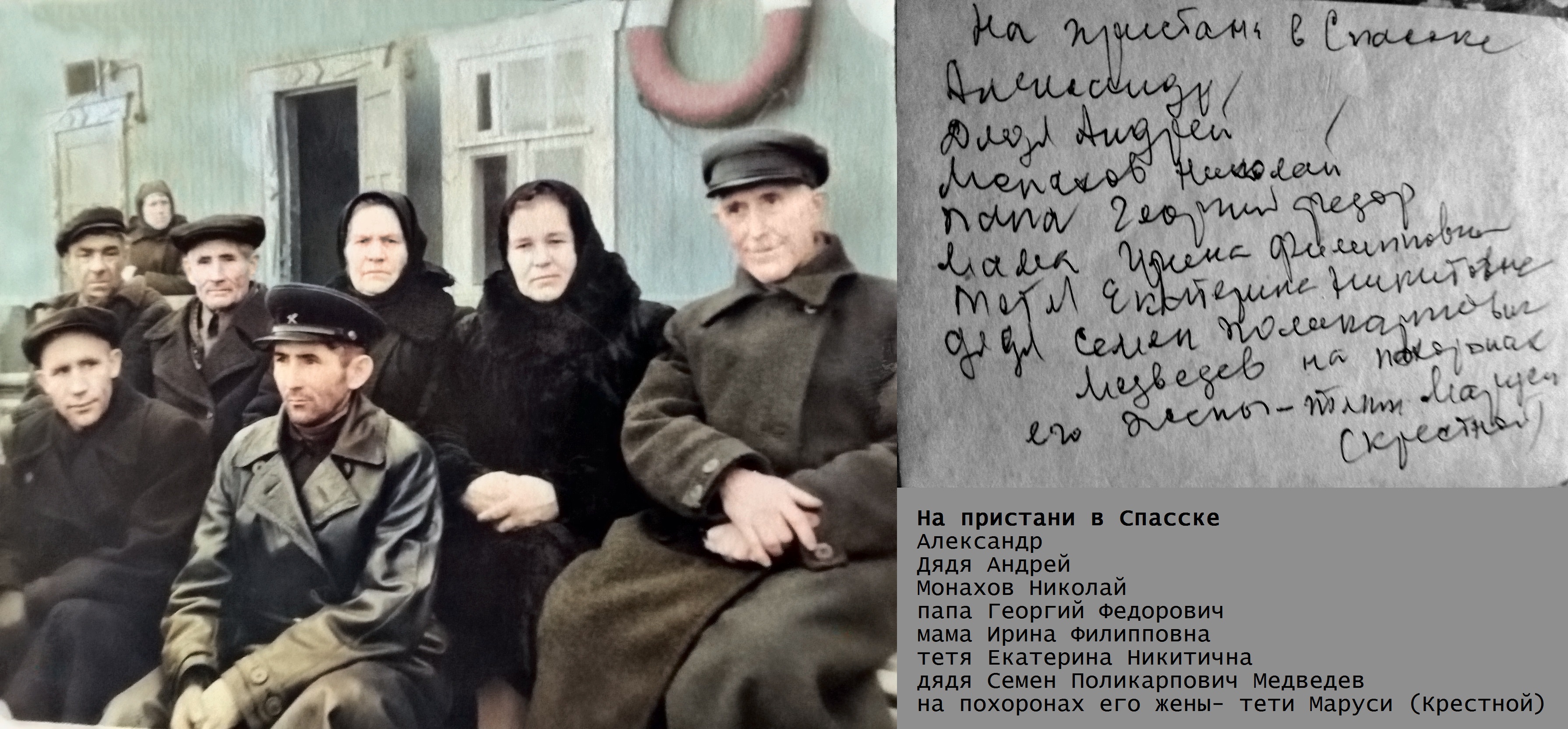 | Изображение | Формат: image/jpeg Размеры картинки: 3 580 × 1 664 пикселей Размер файла: 1 501 Кбайт Примечание: На пристани в Спасске: Сзади у двери неизвестный человек. Ближе сидят: Монахов Николай, Кайновы Георгий Федорович, его супруга Ирина Филипповна, Екатерина Никитична, Медведев Семен Поликарпович. Еще ближе сидят: Кайновы Александр Георгиевич, Андрей Федорович. Снимок выполен на похоронах супруги Медведева Семена Поликарповича - Марии Федорвны Медведевой |