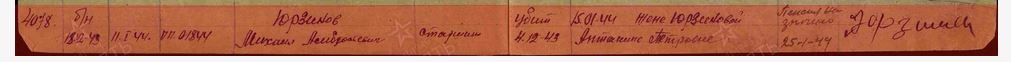 | Примечание | Последнее место службы п/п 1844 Воинское звание старшина Причина выбытия убит Дата выбытия 04.12.1943 Название источника донесения Даниловский ОВК, г. Москва Номер фонда источника информации Таганский РВК Номер описи источника информации 1944 |