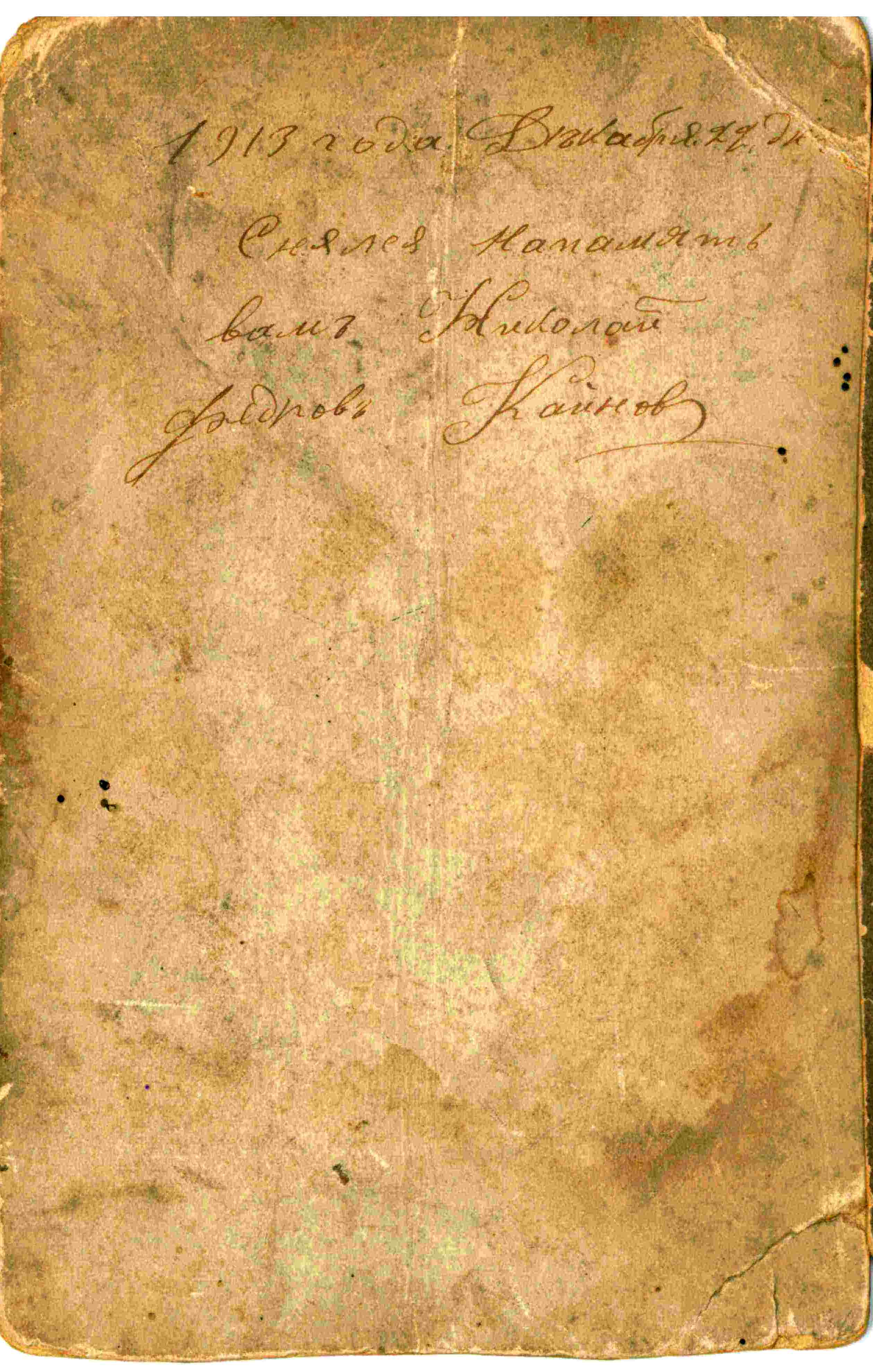 | Изображение | Формат: image/jpeg Размеры картинки: 883 × 1 417 пикселей Размер файла: 754 Кбайт Примечание: На обороте текст: 1913 года Декабря 22 дня Снялся Напамять вамъ Николай Федоровъ Кайнов |