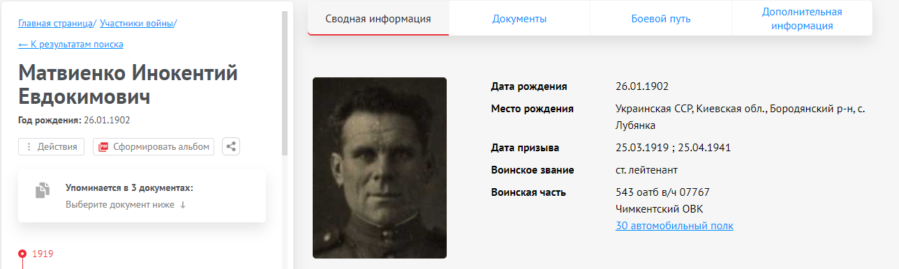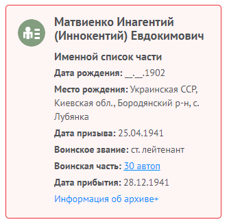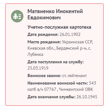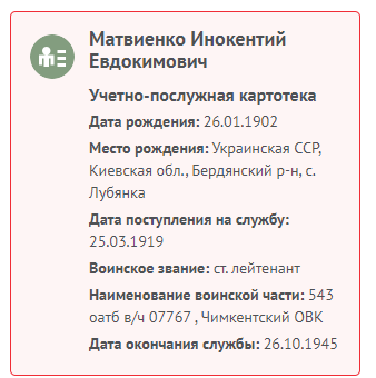 ФИО: Иннокентий Евдокимович /Матвиенко/ Род занятий: ст. лейтенант — с 25 марта 1919 до 26 октября 1945 Рождение: 26 января 1902 — Украинская ССР, Киевская обл., Бердянкий р-н, с. Лубянка Смерть: |