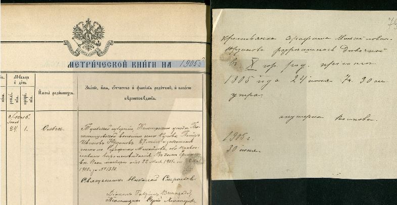 крестьянка Серафима Михайлова Юрзинова разрѣшилась дѣвочкойа въ Х гор. род. пріемнике 1905 года 24 Iюня 7ч. 30 м. утра. Подпись: акушерка Васикова 1905 г. 30 июня