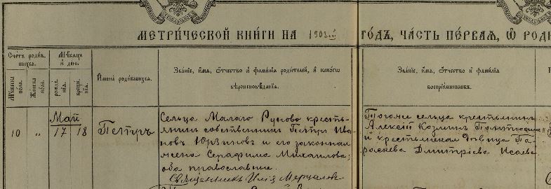 Сельца Малаго Рунова крестьянинъ собственник Петръ Ивановъ Юрзиновъ и его законная жена Серафима Михайлова; оба православные
