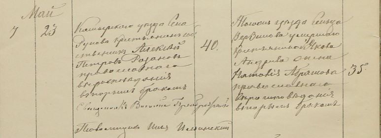 Каширскаго уѣзда Села Рунова крестьянин собственникъ Алексѣй Петровъ Розановъ православнаго вѣроисповѣданія вторым браком 40 лет и тогоже уезда Сельца Верзинова умершего крестьянина Якова Андреева сына Наталiя Абрамова православного вероисповедания 35 лет