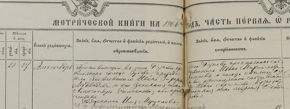 Родители: Проживающий в селе Рунове крестьянин сельца Зубова, прихода села Яковлевского Иван Захарiев Медведев и его законная жена Александра Самсонова, оба православные.