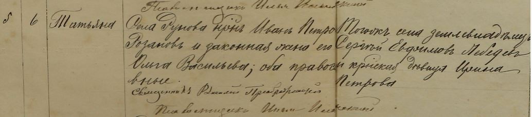 Восприемники: Того же села землевладелец Сергей Ефимов Лебедев и крестьянская девица Ирина Петрова