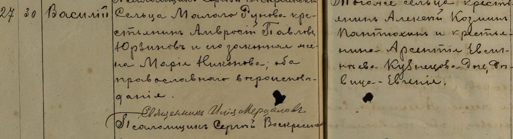 Восприемники: Того же сельца крестьянин Алексей Козмин Пантюхин и крестьянина Арсентия Евстигнеева Кузнецова дочь, девица - Евгенiя.