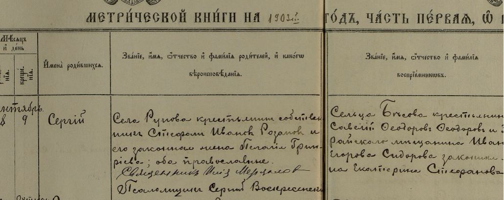 Родители: Села Рунова крестьянин собстванникъ Стефанъ Ивановъ Розановъ и его законная жена Пелагія Григоріева; оба православные.
