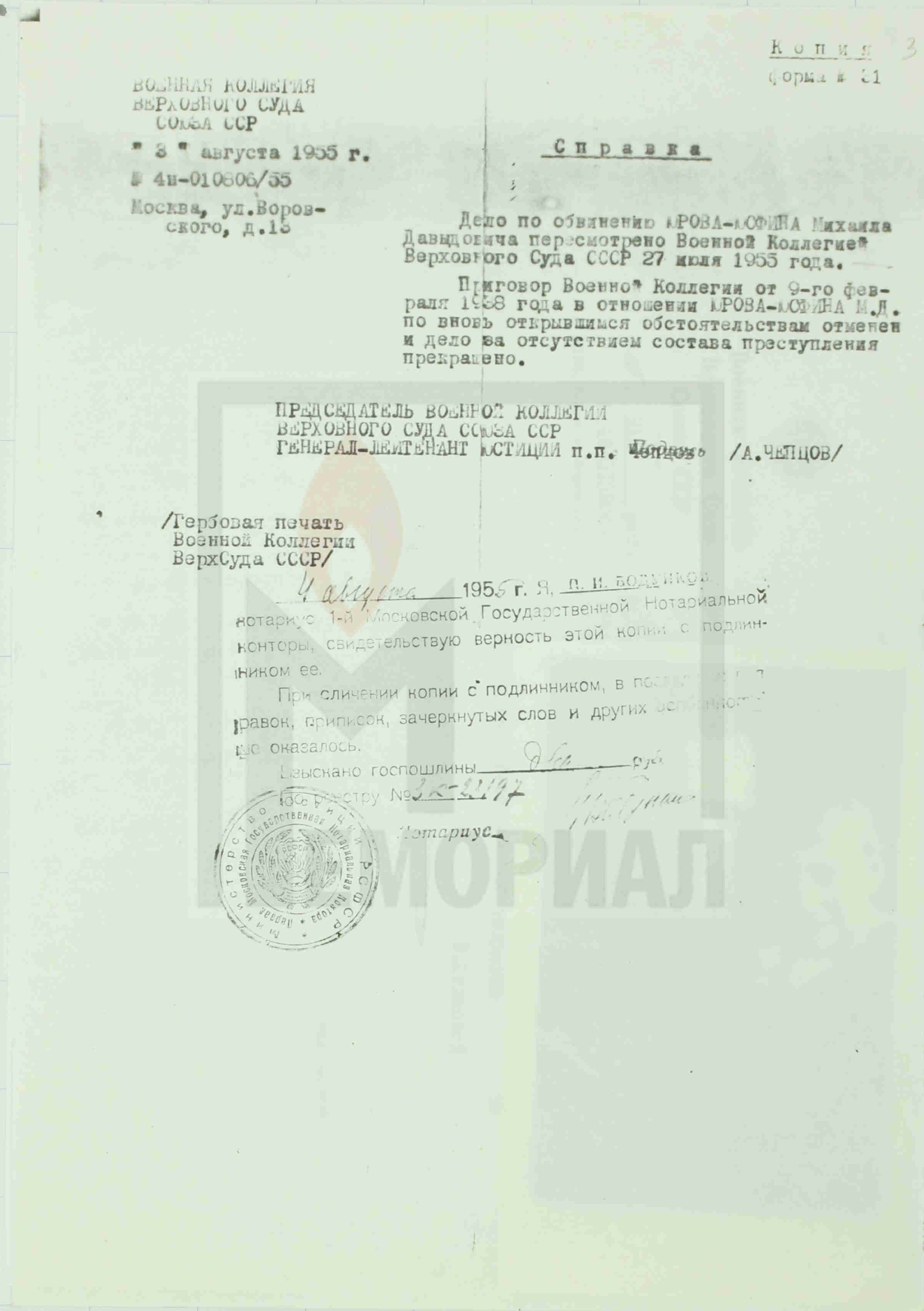 Дело по обвинению ЮРОВА-ЮСФИНА Михаила Давыдовича пересмотрено Военной Коллегией Верховного Суда СССР 27 июля 1955 года.