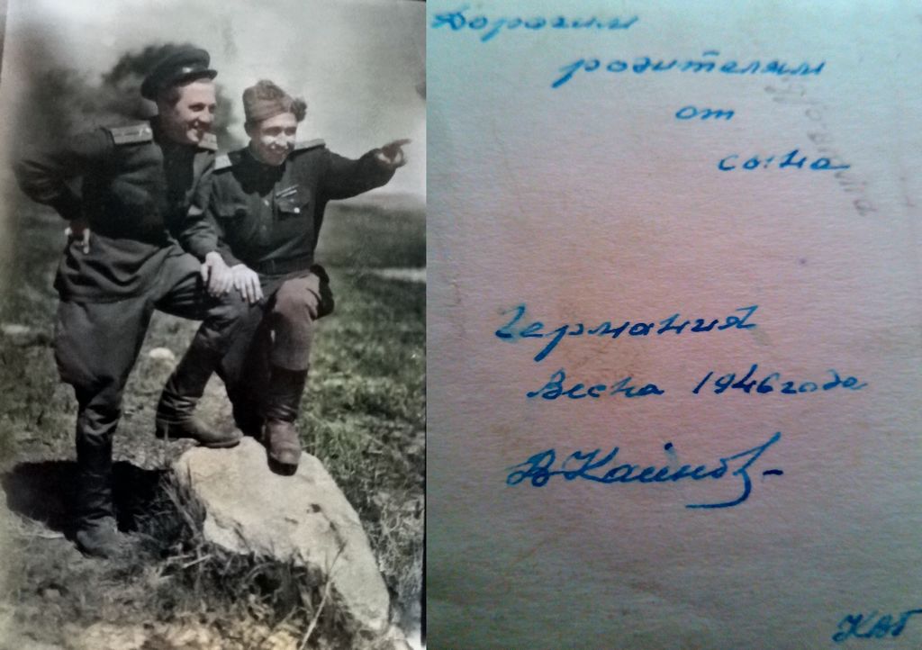 | Изображение | Формат: image/jpeg Размеры картинки: 1 024 × 722 пикселей Размер файла: 108 Кбайт Примечание: Дорогим родителям от сына. Германия, весна 1946 год. Владимир Кайнов.