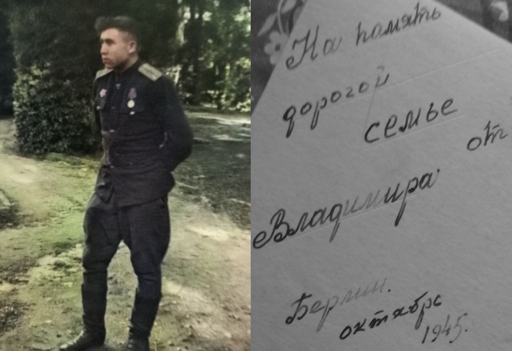 | Изображение | Формат: image/jpeg Размеры картинки: 1 024 × 676 пикселей Размер файла: 78 Кбайт Примечание: На память бабушке и дяде от внука и племянника. Владимир. Берлин. 01.08.1945. |
