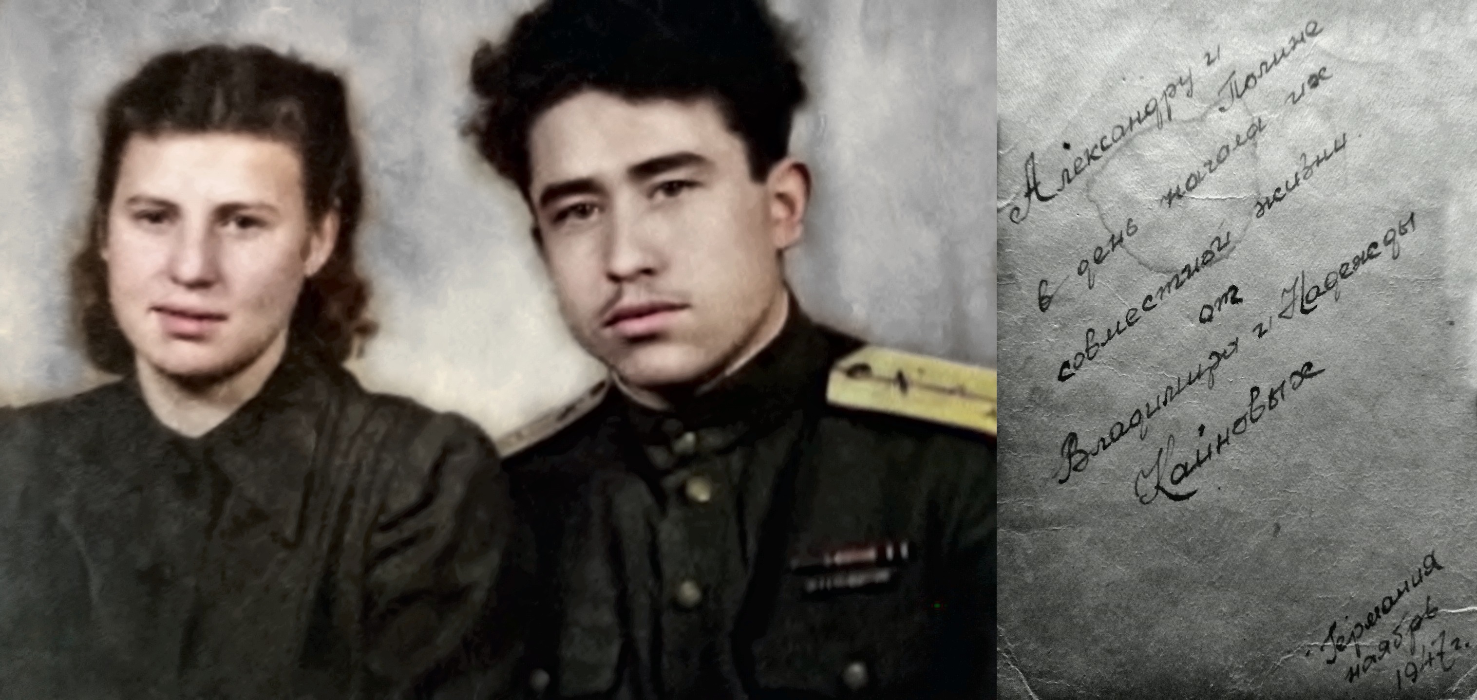 | Изображение | Формат: image/jpeg Размеры картинки: 3 032 × 1 438 пикселей Размер файла: 891 Кбайт Примечание: Александру и Полине в день начала их совместной жизни от Владимира и Надежды Кайновых Германия, ноябрь 1947г. |