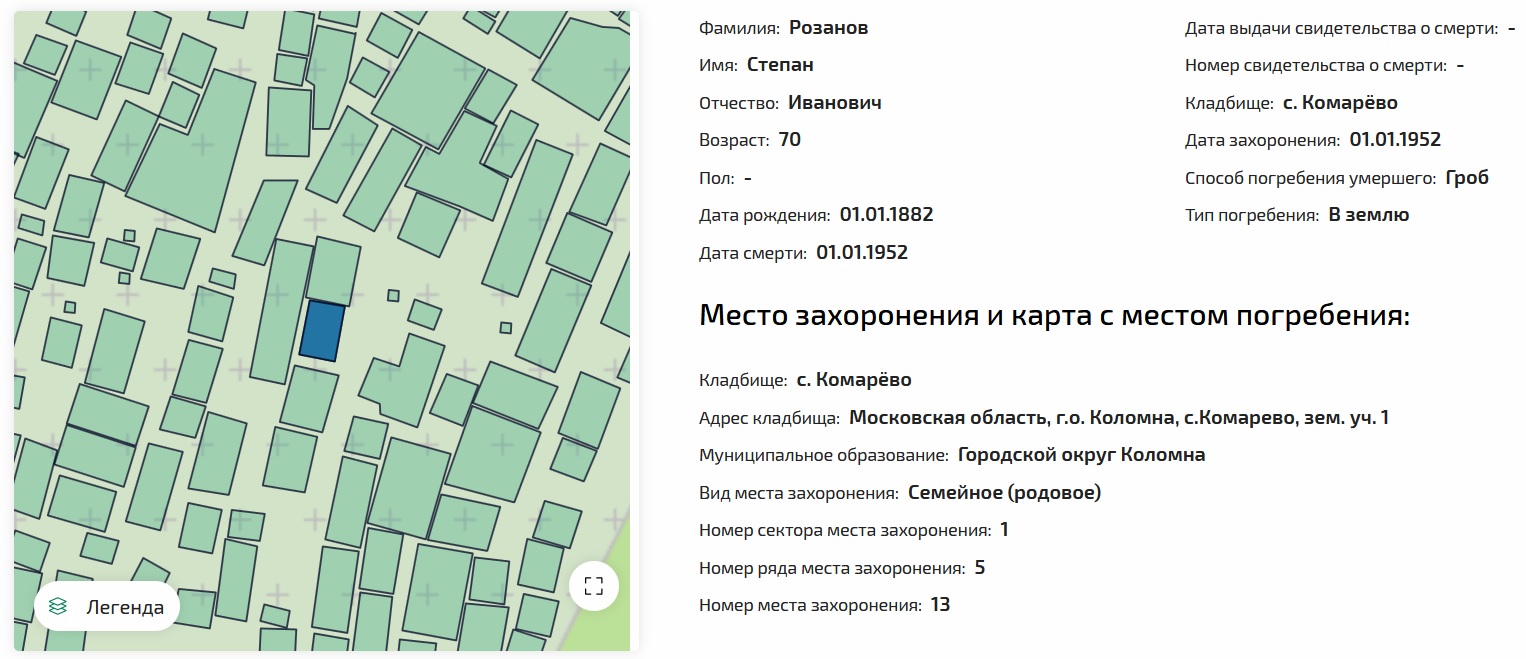 | Смерть | Дата смерти примерная. Взята из информации о захоронении с публичного сайта https://rgis.mosreg.ru/v3/#/burial/1194613160 |