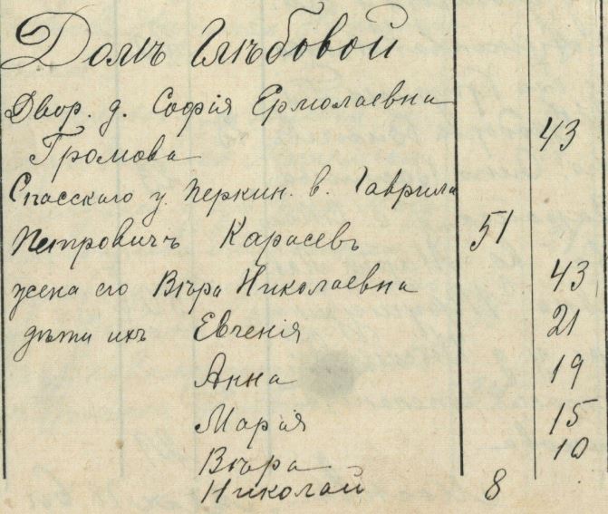 Дата: 1913 Содержание: ИСПОВЕДНАЯ ВЕДОМОСТЬ ЦЕРКВИ НИКОЛАЕВСКОЙ НА КУРЬИХ НОЖКАХ 1 января 1913 — 31 декабря 1913 ЦГА Москвы, фонд №2125, опись №1, дело №989, стр. 8 Архив ЦГА Москвы Фонд ЦЕРКВИ ПРЕЧИСТЕНСКОГО СОРОКА Г. МОСКВЫ ВЕДОМСТВА МОСКОВСКОЙ ДУХОВНОЙ КОНСИСТОРИИ. Опись Опись №1 Дом Глебовой. Рязанск. губ., Спасск.у., Перхинской вол. беззем. кр. [безземельный крестьянин] Гаврилъ Петровичъ Карасевъ 59 жена его Вера Николаева 51 Дети ихъ: Николай 16 Клавдiя 14 Михаилъ 12 Александра 8 Для просмотра скрина нажмите иконку: |