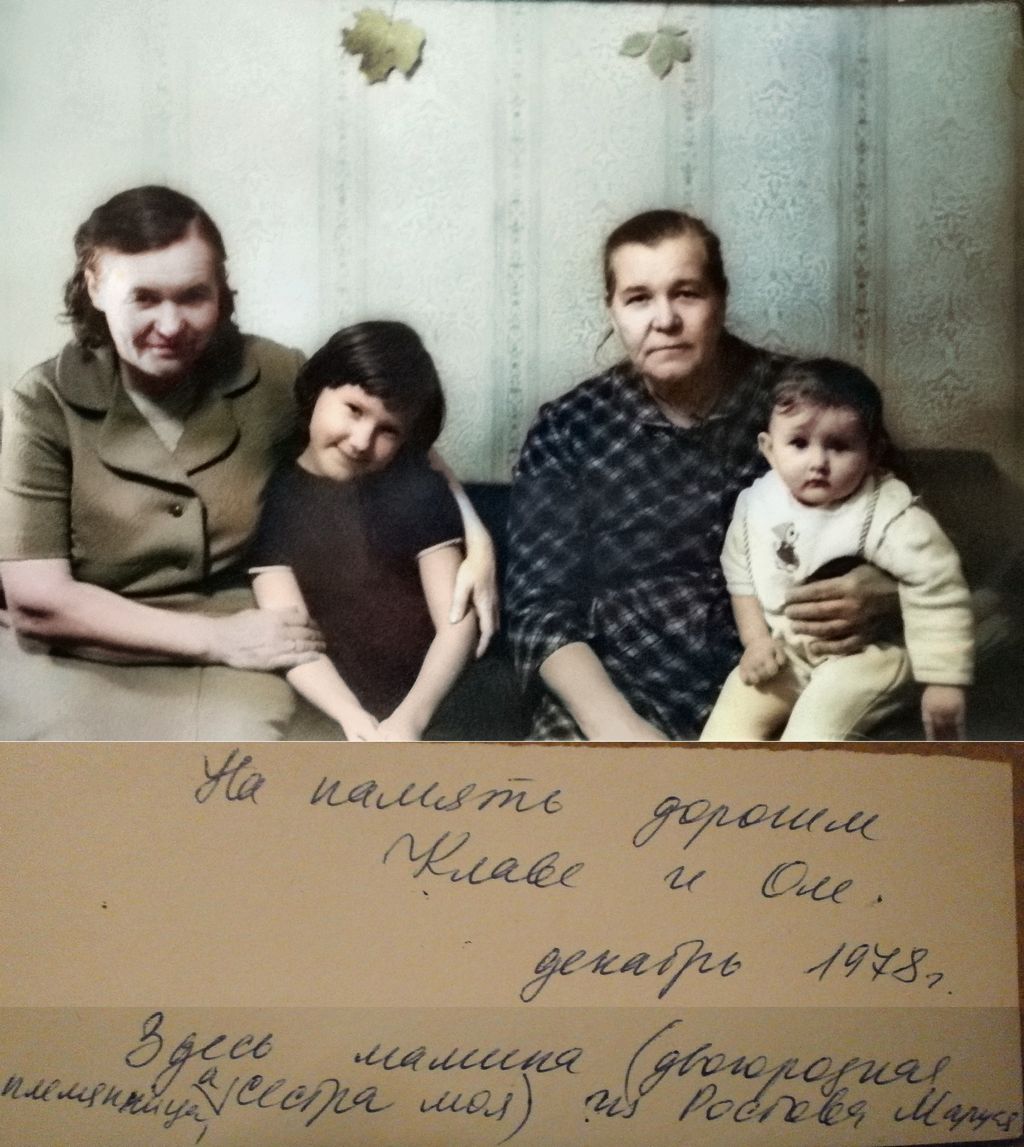 | Изображение | Формат: image/jpeg Размеры картинки: 1 024 × 1 147 пикселей Размер файла: 162 Кбайт Примечание: Подпись: "На память дорогим Клаве и Ольге, декабрь 1978. Здесь мамина (двоюродная племянница, а сестра моя) из Ростова Маруся" Комментарий Борщевой Галины Андреевны: "Декабрь 78г- это год отправки фото т Клаве и Оле. А слева - мамина племянница Мария" |