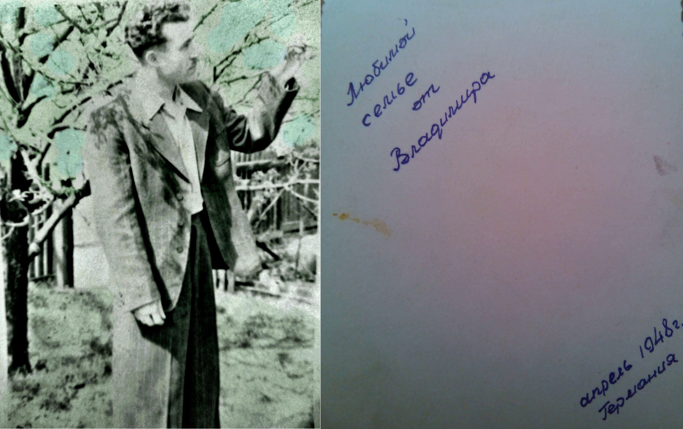| Изображение | Формат: image/jpeg Размеры картинки: 2 184 × 1 374 пикселей Размер файла: 689 Кбайт Примечание: Любимой семье от Владимира апрель 1948г. Германия |