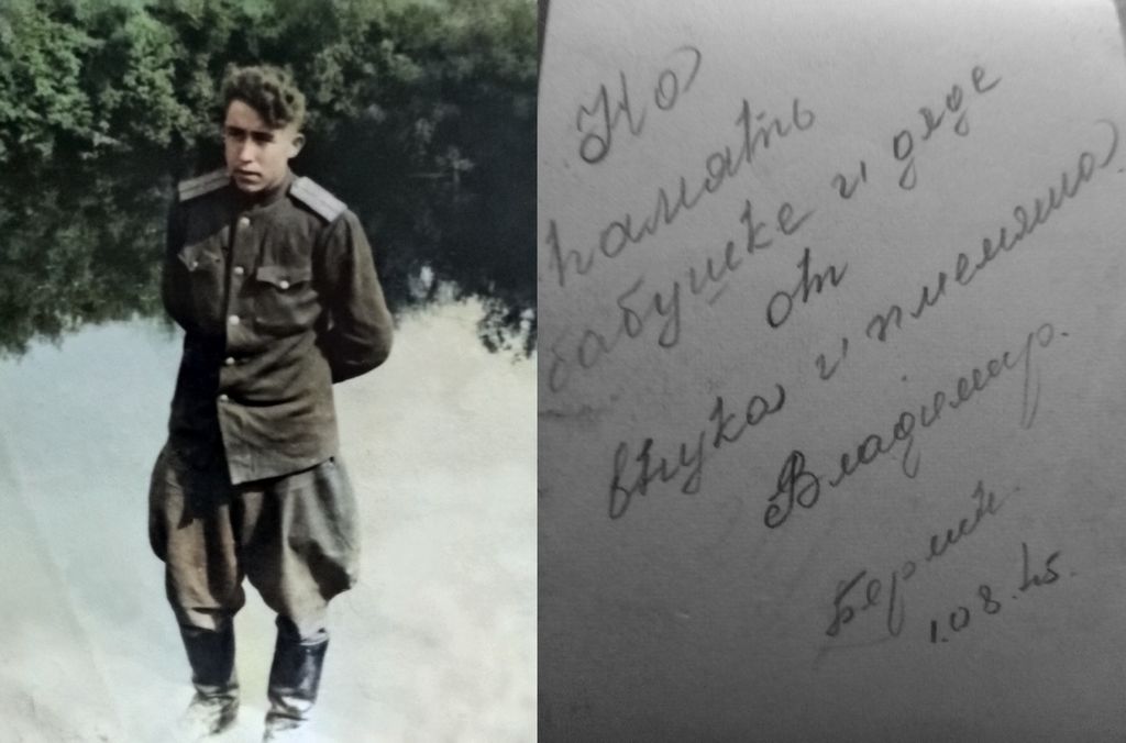 | Изображение | Формат: image/jpeg Размеры картинки: 1 024 × 676 пикселей Размер файла: 78 Кбайт Примечание: На память бабушке и дяде от внука и племянника. Владимир. Берлин. 01.08.1945. |