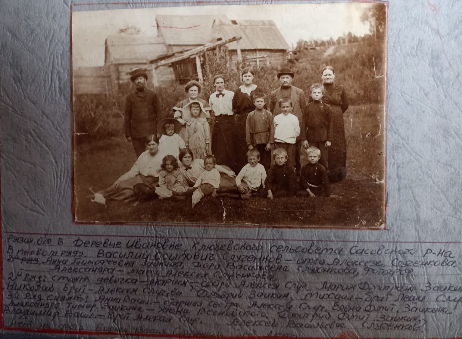 | Изображение | Формат: image/jpeg Размеры картинки: 1 534 × 1 126 пикселей Размер файла: 475 Кбайт Примечание: Подпись:Рязан. Обл. в Деревне Ивановке Ключевского сельсовета Сасовского р-на. В первом ряду: Василий Осипович Слученков - отец Алексея Слученкова, Анна Тимофеевна Заикина, Дора Васильевна Слученкова, Фотограф, Александра - мать Алексея Слученкова. 2й ряд: стоят девочка - Мария - сестра Алексея Слученкова, Мария Дмитриевна Заикина, Николай брат - Алексея Слученкова, Дмитрий Заикин, Михаил - брат Леши Слученкова. 3й ряд сидят: Анна Васильевна - старшая сестра Алексея Слученкова, Елена Дмитриевна Заикина, Александра Тимофеевна Заикина - жена Всеновского, Дмитрий Дмитриевич Заикин, Владимир Васильевич - брат Алексея Слученкова, Алексей Васильевич Слученков. Нет на фото Бориса Васильевича Слученкова, брата Алексея |
