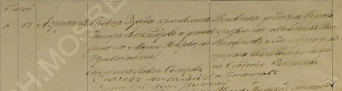| Рождение сестры | Агриппина Захарова Медведева 6 июня 1876 (Возраст 3 года) Источник: Рождение Агриппины Захаровой Медведевой Внешний ресурс: Web-сайт/URL сайта Содержание: 1876 года Июня 6 дня родилась Агриппина Родители: Сельца Зубова крестьянин Захаръ Александровъ и законная жена его Марфа Петрова, оба православные Примечание: https://arch.mosreg.ru/srv/private/imageViewer/show?objectId=251483007&attributeId=5908&serial=1&group=4688&ext=.jpg страница 117 Прочитать информацию с портала https://arch.mosreg.ru/ могут только зарегистрированные там пользователи. |