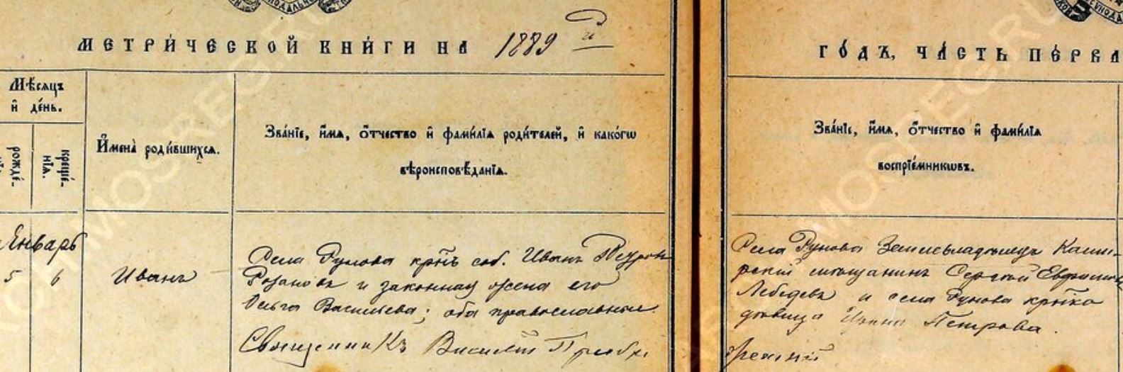 | Рождение неполнородного брата | Иван Иванов Розанов 5 января 1889 (Возраст 2 года) Источник: Рождение Розанова Ивана Иванова Внешний ресурс: Web-сайт/URL сайта Содержание: Января 5 дня родился Иванъ Родители: Села Рунова крнъ Иванъ Петровъ Розановъ и законная жена его Ольга Васильева; оба православные Восприемники: Села Рунова землевладелецъ Каширский мещанiн Сергей Евфимиев Лебедевъ и села Рунова крнка девица Ирина Петрова Примечание: https://arch.mosreg.ru/srv/private/imageViewer/show?objectId=2176512281&attributeId=5908&serial=1&group=4688&ext=.jpg Страница 209 Просмотреть данную ссылку можно только зарегистрированным на портале https://arch.mosreg.ru/ пользователям. |