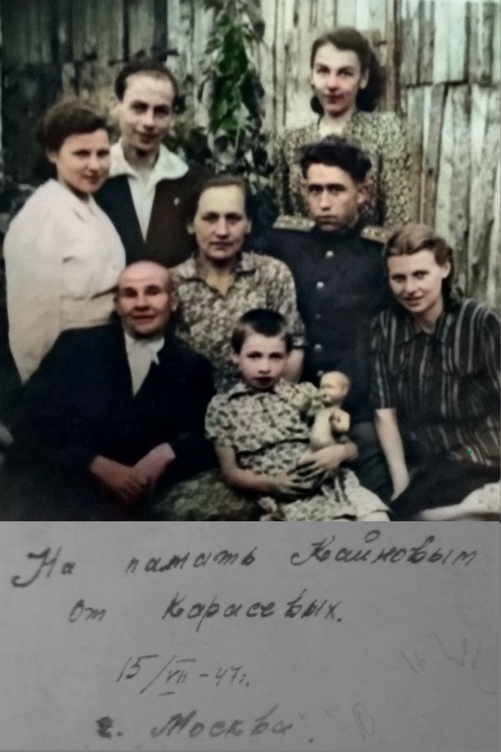 | Изображение | Формат: image/jpeg Размеры картинки: 1 024 × 1 538 пикселей Размер файла: 167 Кбайт Примечание: На память Кайновым от Карасёвых 15.07.1947 г. Москва Слева Карасёвы Николай с супругой Анной, ниже отец Николай Гаврилович с матерью Матреной Филипповной, справа Кайновы Владимир с Надеждой, сзади Тамара Лындина, впереди Людмила Карасёва |