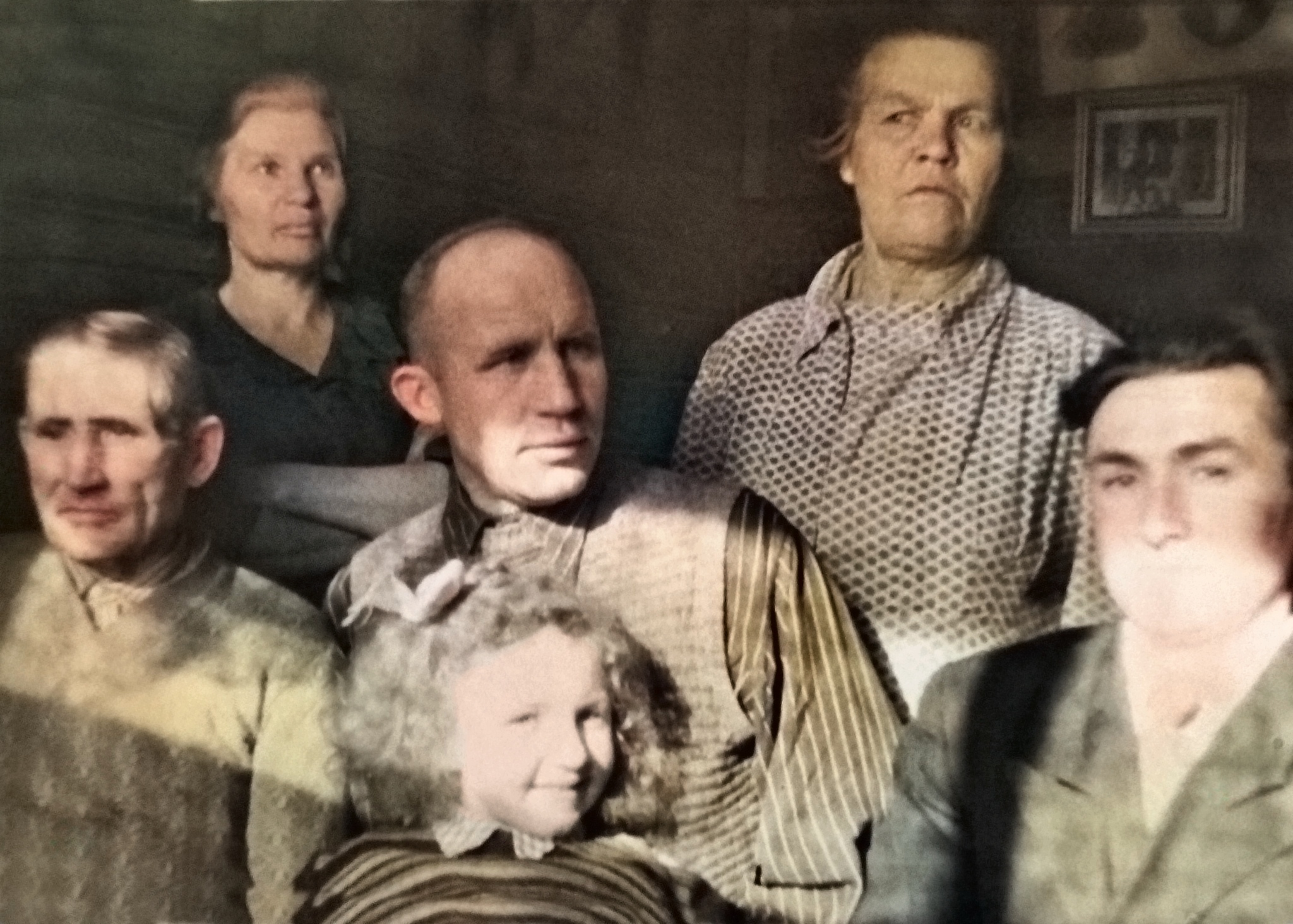 | Изображение | Формат: image/jpeg Размеры картинки: 2 048 × 1 588 пикселей Размер файла: 1 401 Кбайт Примечание: Стоят: Медведевы Юрий Семенович и Рада Леонидовна, Кайновы: Клавдия Георгиевна, Андрей Федорович, Александр Георгиевич; Сидят: Кайнова Ирина Филипповна, Медведева Мария Федоровна, Медведев Семен Поликарпович с внуком Александром, Кайнов Георгий Федорович с внучкой Ольгой. |